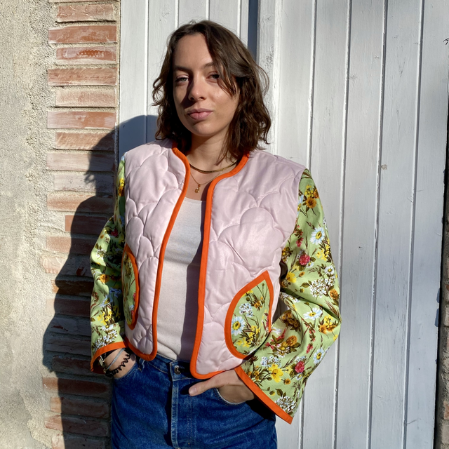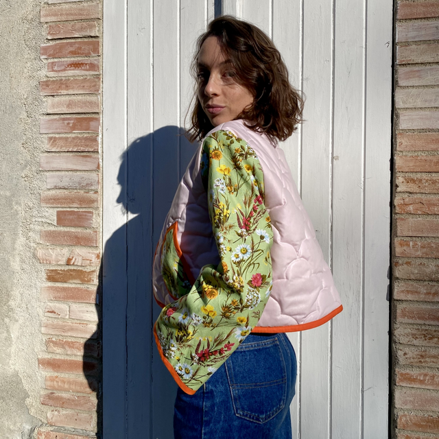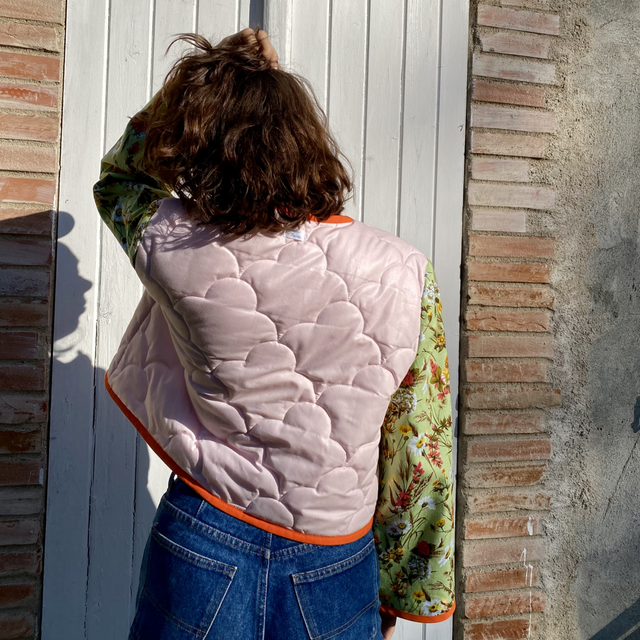 Cette veste est une pièce unique réalisée dans un couvre-lit de seconde main rose poudré au matelassage formant de petits nuages.